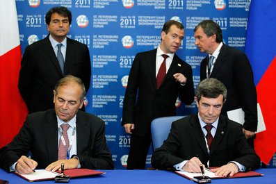 The deal for the first two Mistrals, that is. With President Medvedev looking on, Rosoboroneksport’s Anatoliy Isaykin and DCNS’ Patrick Bouasie signed the contract at the Petersburg International Economic Forum. RIA Novosti quoted Isaykin on the €1.2 billion price. Work can begin after the Russians pay an advance (Versii.com repeated a rumor that the French wanted 80 percent prepayment).
