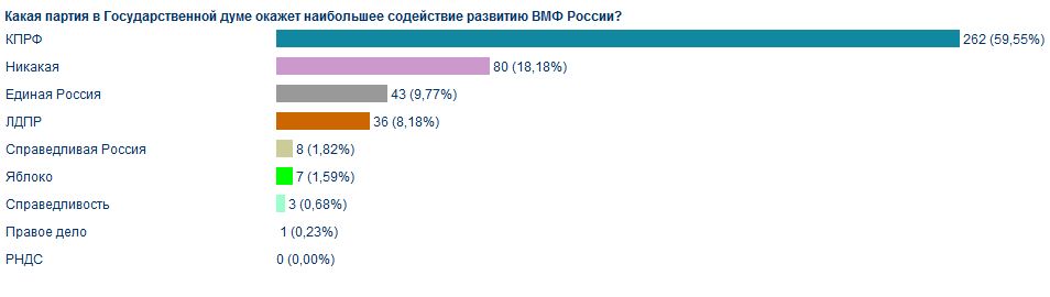 Bucking Russia’s electoral law, Flot.com still permits an “against all” option.  So 18 percent say no party will provide the greatest assistance in the development of the VMF.