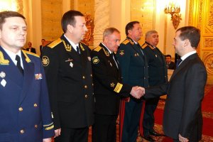 Tuesday Russia’s lame duck President and Supreme CINC Dmitriy Medvedev greeted a group of military men — Armed Forces, MVD, FSB, SVR, and MChS officers — in the Grand Kremlin Palace’s St. George’s Hall to congratulate them on their new command positions or promotions to higher ranks.