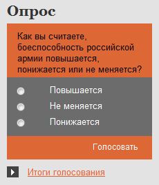 A nice find on Mil.ru . . . the Defense Ministry website has the Internet poll above on its front page. If you click on Voting Results, you go to the results of all surveys conducted by the Defense Ministry’s Sociological Center.