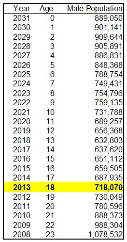 The data below came from the U.S. Census Bureau, but the birth year in the left column was changed to indicate the year group will turn (or turned) 18. The age column is the year group’s age in 2013. According to this, you can see the nadir of the “hole” doesn’t come until 2018 and the climb out is long and slow. The number of males born doesn’t even return to the level of 1990 (shown here as 2008) until some time after 2031.