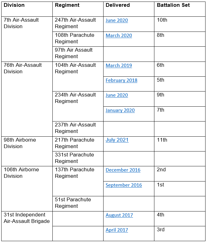 Usually less than 40 armored vehicles (mostly BMD-4M), these eleven battalion sets represent about 400 new pieces of equipment so far.